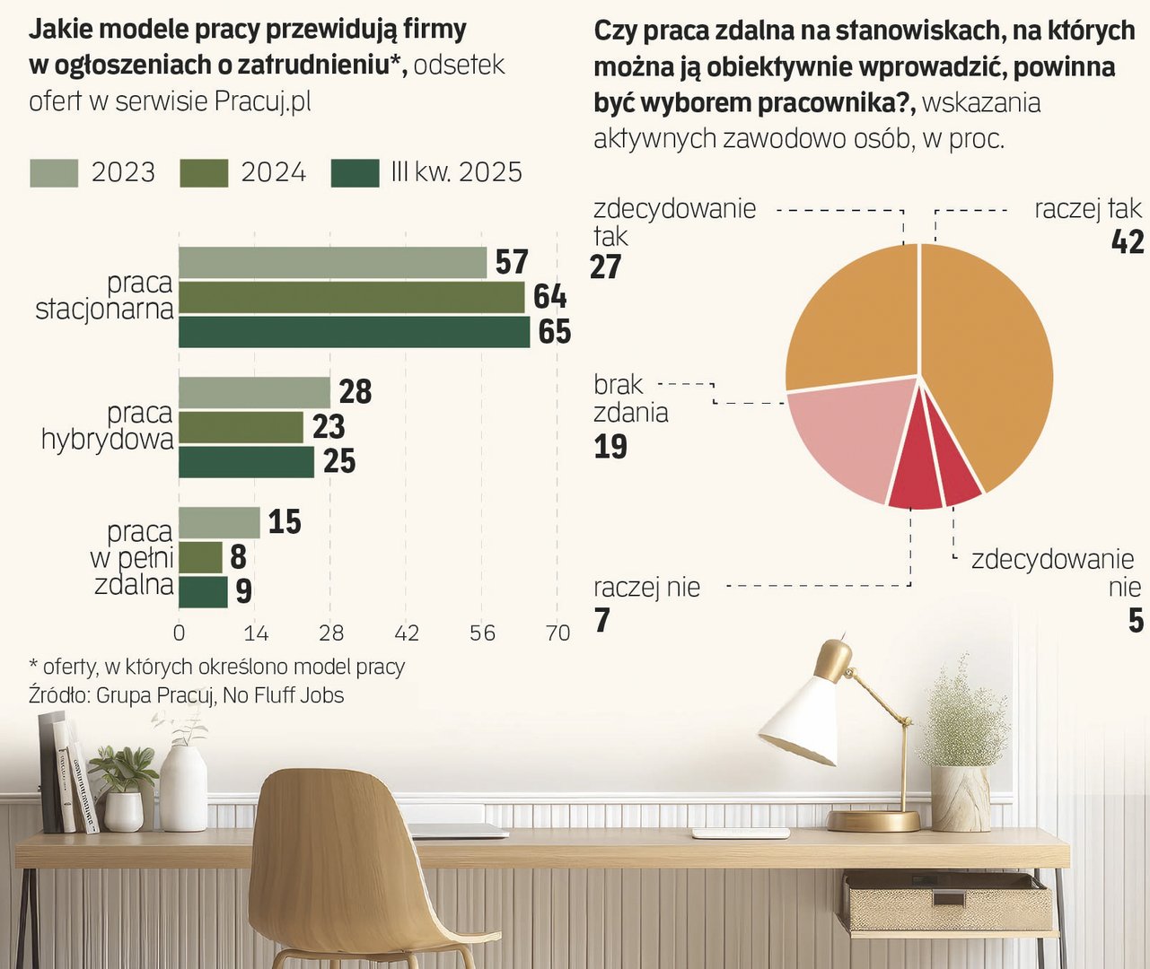 Aż 65 proc. ogłoszeń pracodawców opublikowanych w III kwartale 2025 r. dotyczyło pracy stacjonarnej, przy utrzymującej się popularności pracy hybrydowej (25 proc. ofert) i niewielkim (9 proc.) udziale ofert pracy zdalnej – wynika z danych portalu Pracuj.pl.