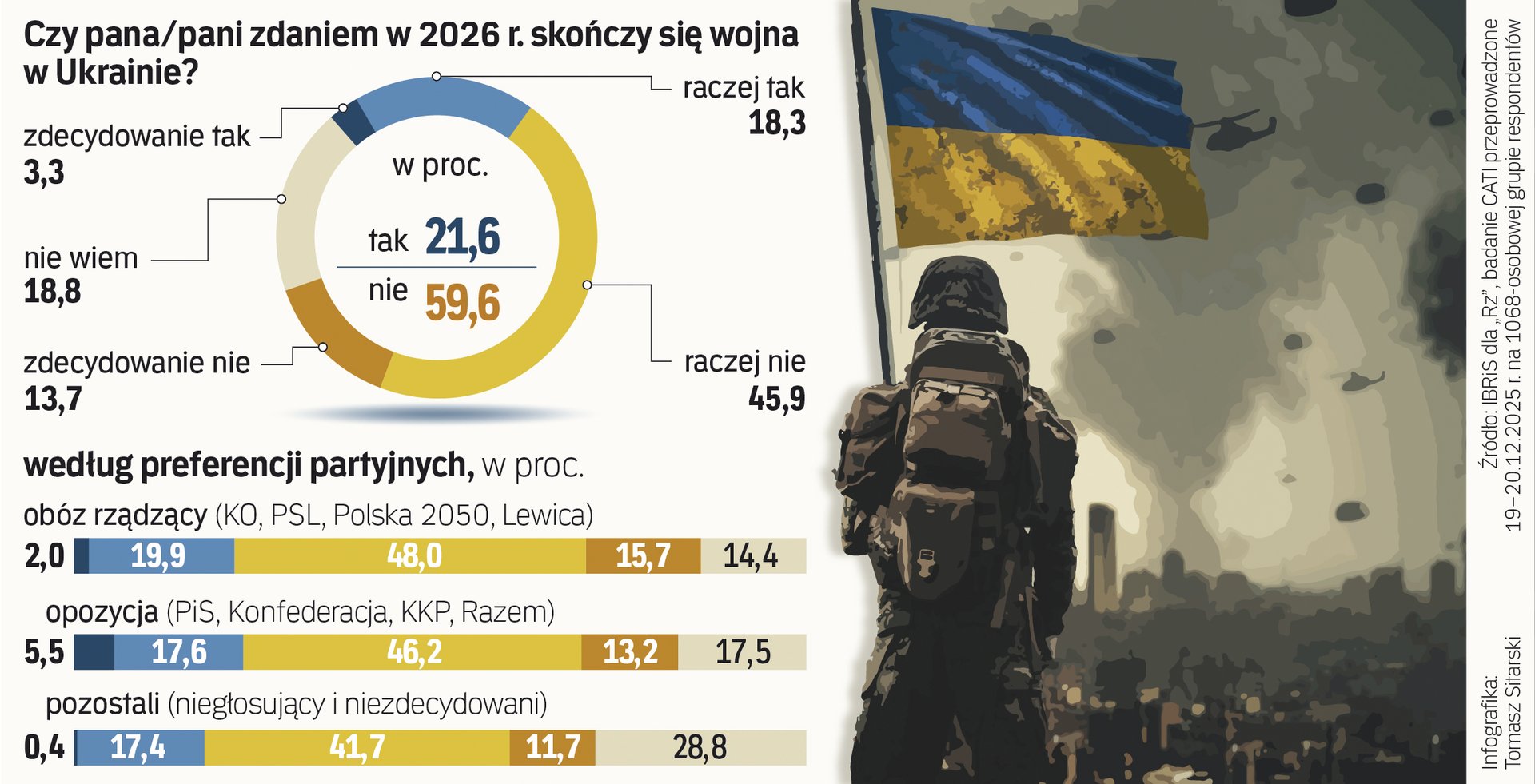 Wśród tych, którzy przypuszczają, że konflikt na wschodzie nie zakończy się w 2026 r. dominują zwolennicy obozu władzy, ale wcale nie dużo mniej jest w tej grupie także stronników opozycji. Informacje o świecie czerpią z kanałów na YouTube oraz podkastów, jak np. Kanał Zero czy Układ otwarty oraz kanałów informacyjnych TVN24, a także Faktów TVN. —Marek Kozubal