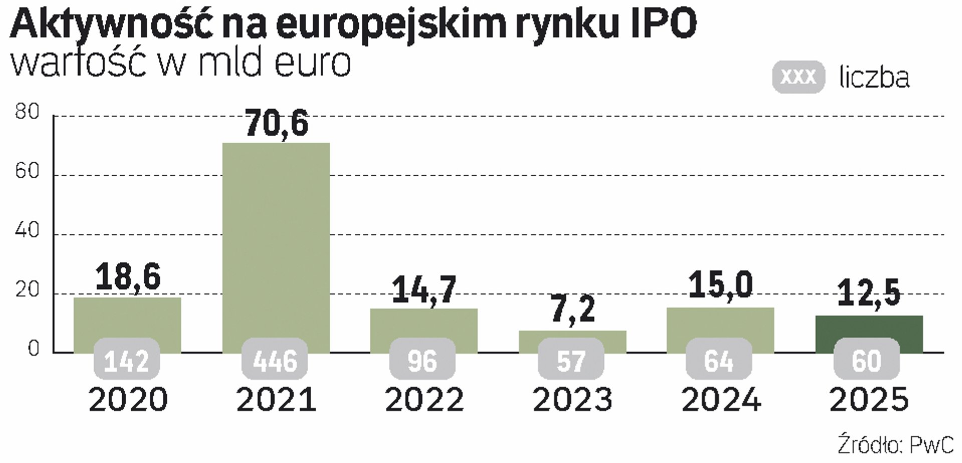Wartość pierwotnych ofert publicznych przeprowadzonych na europejskich giełdach w 2025 r. osiągnęła 12,5 mld euro, co stanowi spadek o 17 proc. wobec 2024 r. – wynika z najnowszego raportu PwC. Wobec 2023 r. widać wprawdzie wzrost, ale warto mieć na uwadze, że wtedy rynek IPO zanotował wieloletni dołek z wartością ofert sięgającą zaledwie 7,2 mld euro. Dla porównania: w 2020 r. było...