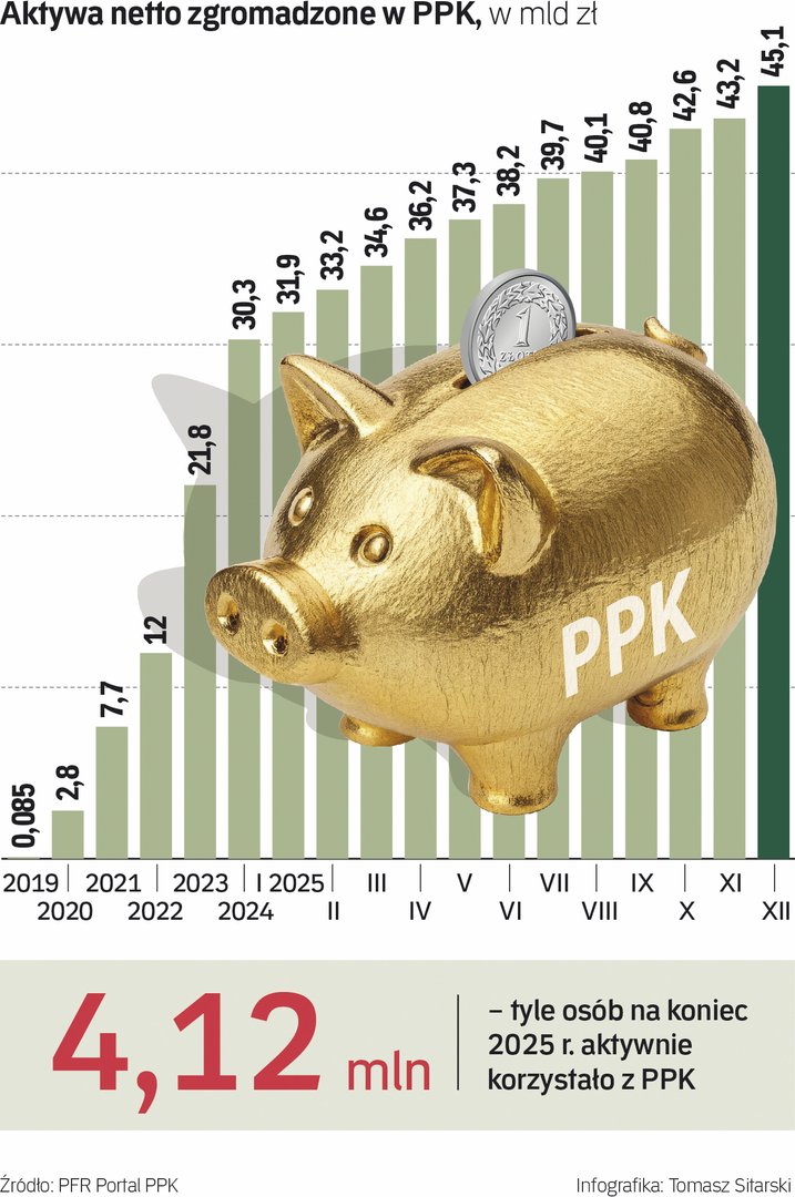 „Pracownicze Plany Kapitałowe pobiły kolejny rekord! Aktywa zgromadzone w PPK 31 grudnia 2025 r. osiągnęły 45,06 mld zł, a liczba uczestników wyniosła 4,12 mln osób! Trudno o lepszy prezent na koniec mijającego roku” – obwieścił PFR Portal PPK. Polski Fundusz Rozwoju nadzoruje funkcjonowanie PPK, zaś portal mojePPK.pl jest oficjalnym źródłem informacji na temat tego programu.