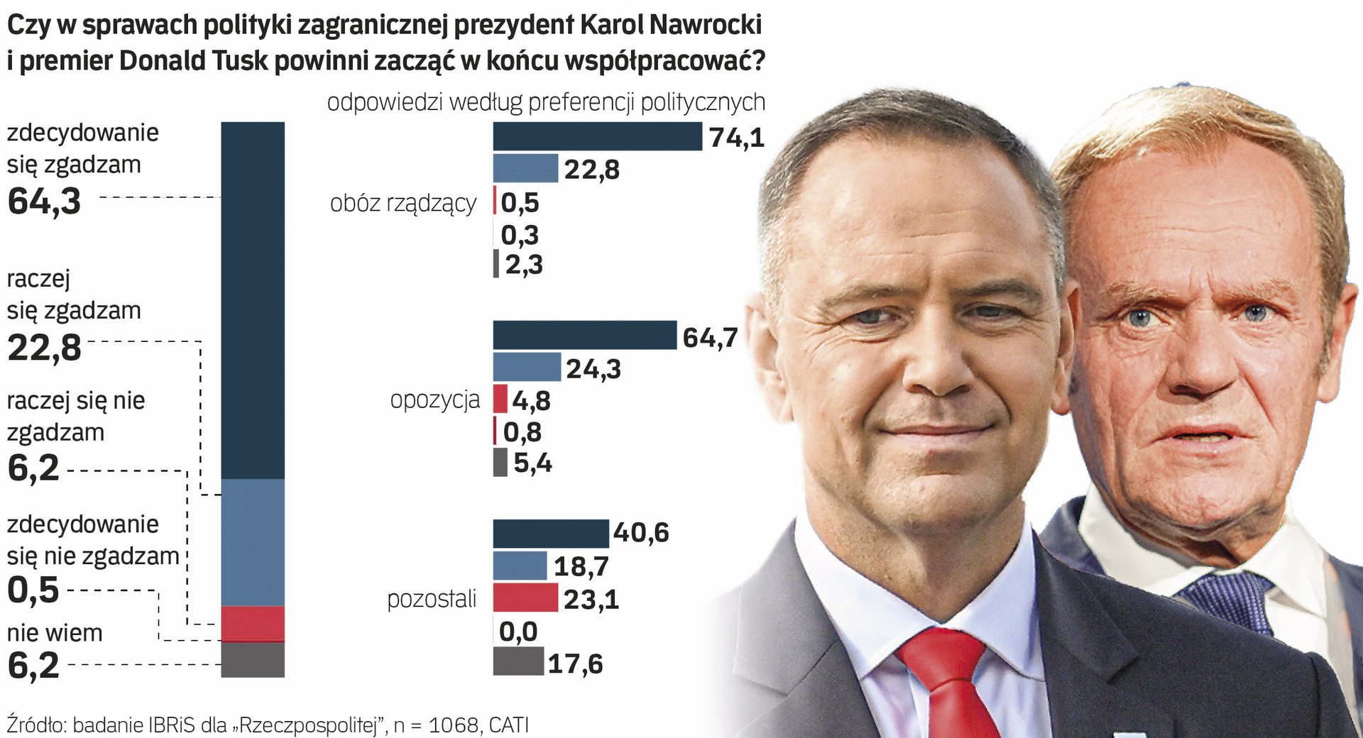 W badaniu IBRiS dla „Rzeczpospolitej” aż 87,1 proc. respondentów wskazuje, że Karol Nawrocki i Donald Tusk powinni działać w porozumieniu. Wśród nielicznych przeciwników takiej współpracy dominują ankietowani, którzy nie głosują w wyborach (23 proc.).