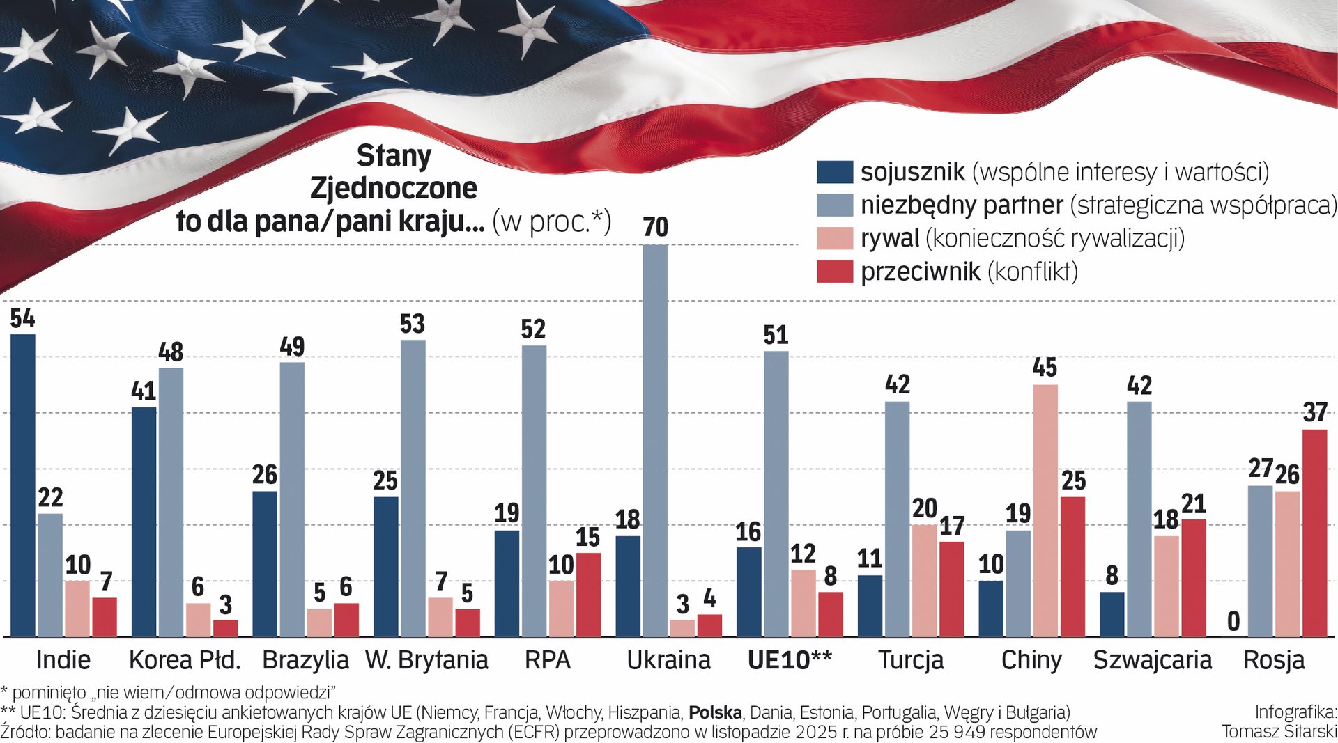 Z przeprowadzonego na zlecenie European Council on Foreign Relations (ECFR) badania wynika, że już tylko 16 proc. ankietowanych w wybranych krajach UE (Niemcy, Francja, Włochy, Hiszpania, Polska, Dania, Estonia, Portugalia, Węgry i Bułgaria) uważa Stany Zjednoczone Donalda Trumpa za sojusznika. Z kolei 51 proc. respondentów uważa, że Ameryka jest wyłącznie „niezbędnym partnerem”. Tymczasem co piąty uczestnik sondażu ECFR uważa, że USA są rywalem lub nawet przeciwnikiem Europy.
