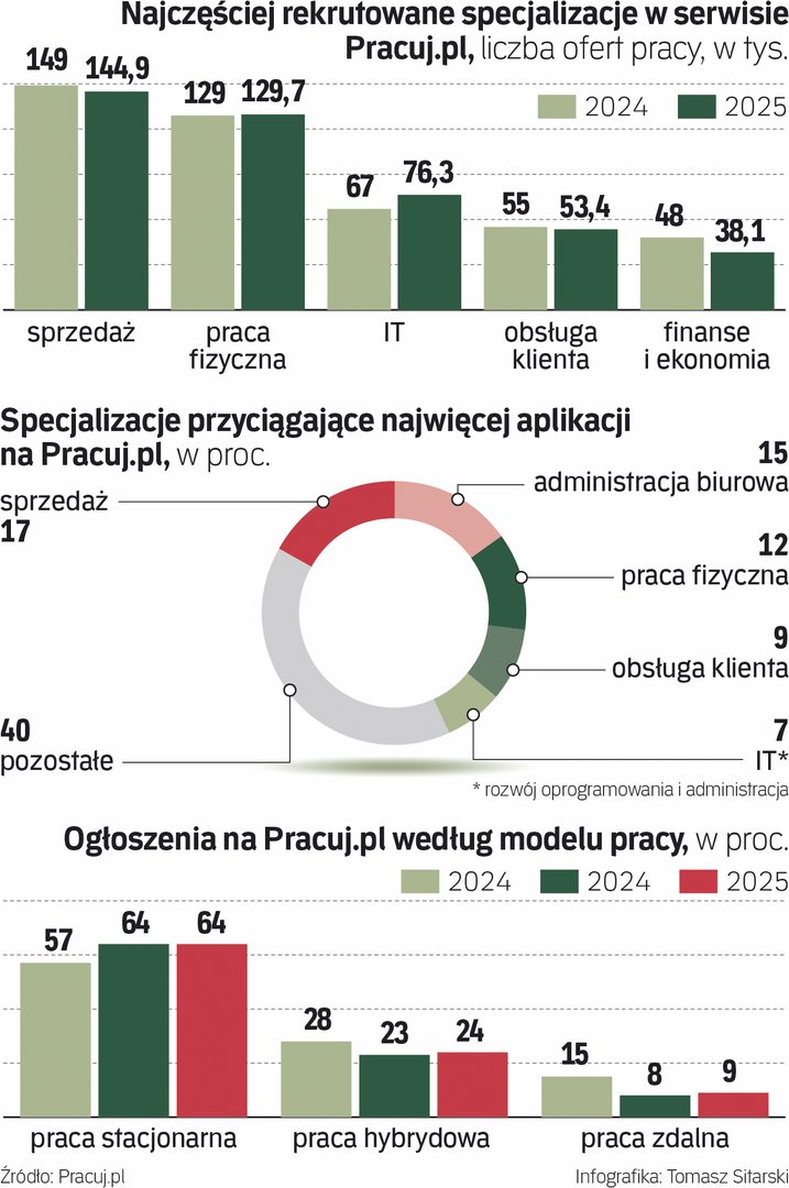 Osoby szukające w ubiegłym roku pracy nie miały w większości łatwego zadania. Przy lekko ujemnej stagnacji w ofertach pracy kolejny rok z rzędu wzrosła liczba aplikacji nadsyłanych przez kandydatów – wynika z podsumowania 2025 r. na Rynku Pracy Specjalistów, które przygotował czołowy portal rekrutacyjny, Pracuj.pl. „Rzeczpospolita” jako pierwsza opisuje jego dane, które potwierdzają, że w wielu branżach i specjalizacjach kandydaci byli w minionym roku na wyraźnie słabszej pozycji niż pracodawcy.