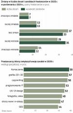 Większość z nich dobrze ocenia miniony rok. Co trzeci z wolnych strzelców uważa, że zapotrzebowanie na jego usługi rośnie, co czwarty ocenia, że w ub. roku było mu łatwiej o klientów niż rok wcześniej, a ponad czterech na dziesięciu badanych twierdzi, że rosnące doświadczenie pozwala im łatwiej docierać do klientów. Ta kwestia jest istotna, gdyż ponad połowa z uczestników badania to osoby z dość krótkim, co najwyżej dwuletnim stażem freelancerskim. Jest jednak znacząca grupa doświadczonych specjalistów, którzy jako wolni strzelcy pracują od co najmniej pięciu lat (23 proc.).