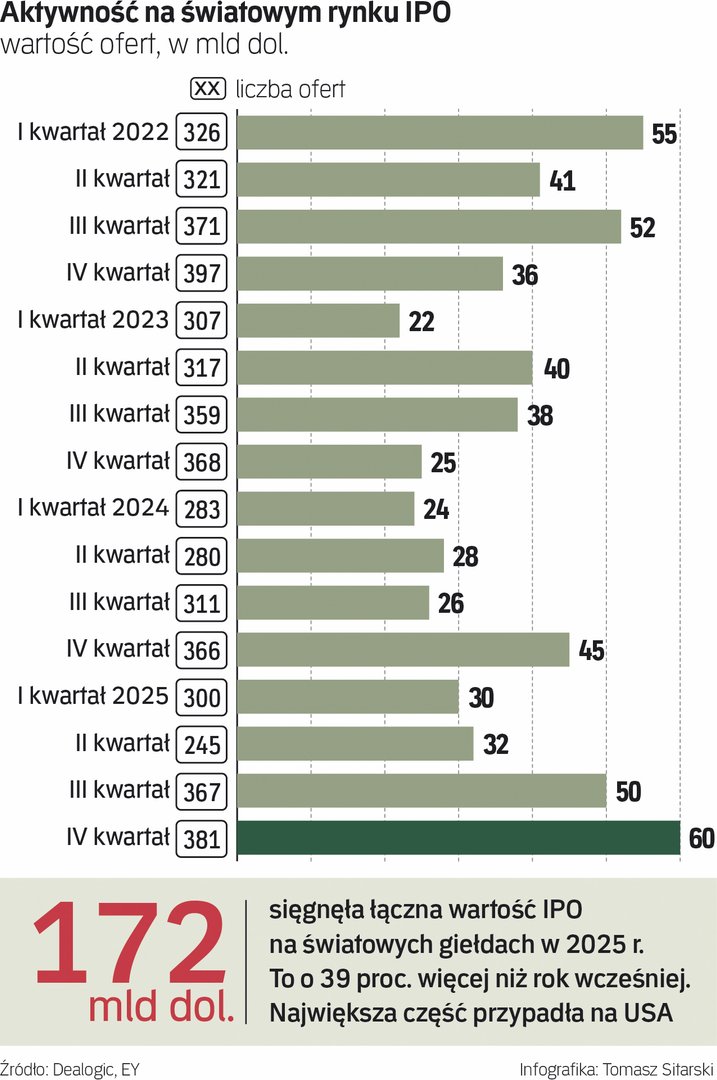 W 2025 r. na świecie przeprowadzono 1 293 debiuty giełdowe. Przyniosły 171,8 mld dol. wpływów, czyli 39 proc. więcej niż rok wcześniej, mimo że liczba transakcji była podobna (53 oferty więcej) – wynika z najnowszego raportu EY.