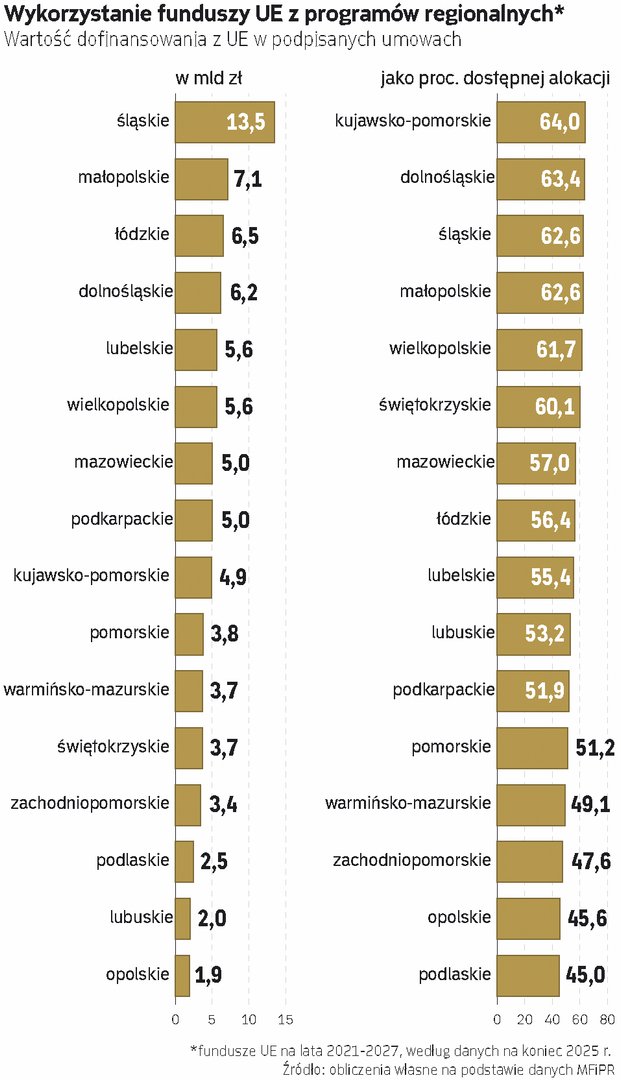 Alokacja funduszy UE na poziomie 57 proc. jest bliska średniej krajowej, ale pomiędzy poszczególnymi regionami widać spore różnice. Liderami pod tym względem są takie województwa, jak kujawsko-pomorskie, dolnośląskie, śląskie, małopolskie, wielkopolskie czy świętokrzyskie, gdzie wykorzystanie dostępnej tam puli funduszy unijnych przekracza 60 proc. (według stanu na koniec 2025 r.). Za to w województwach: warmińsko-mazurskim, zachodniopomorskim, opolskim i podlaskim było to poniżej 50 proc....