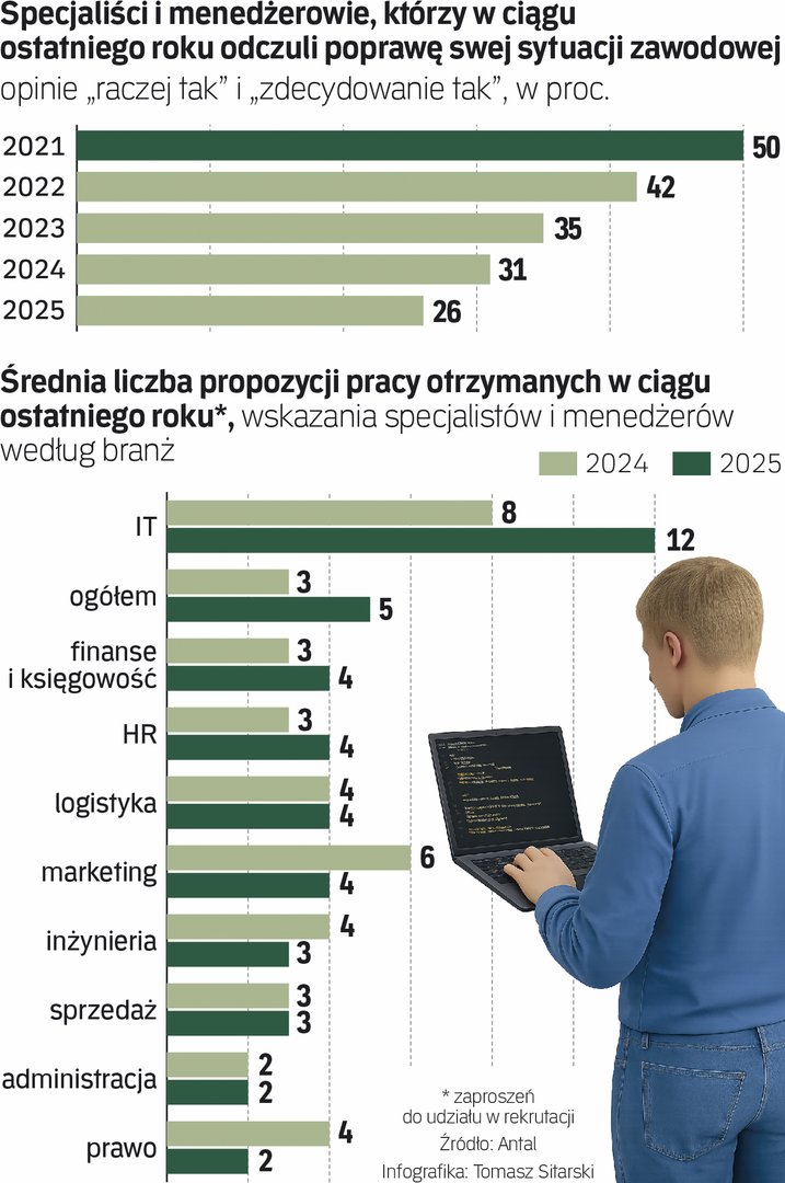 Tylko co czwarty specjalista i menedżer odczuł w ubiegłym roku poprawę swej sytuacji zawodowej. Tych pozytywnych opinii było najmniej od czterech lat – dowodzi najnowsze badanie firmy rekrutacyjnej Antal, która od kilku lat monitoruje trendy i wyzwania na rynku pracy specjalistów i menedżerów. „Rzeczpospolita” jako pierwsza opisuje wyniki tego badania, które pod koniec ubiegłego roku objęło ponad 1,6 tys. osób na stanowiskach specjalistycznych i menedżerskich w różnych branżach.