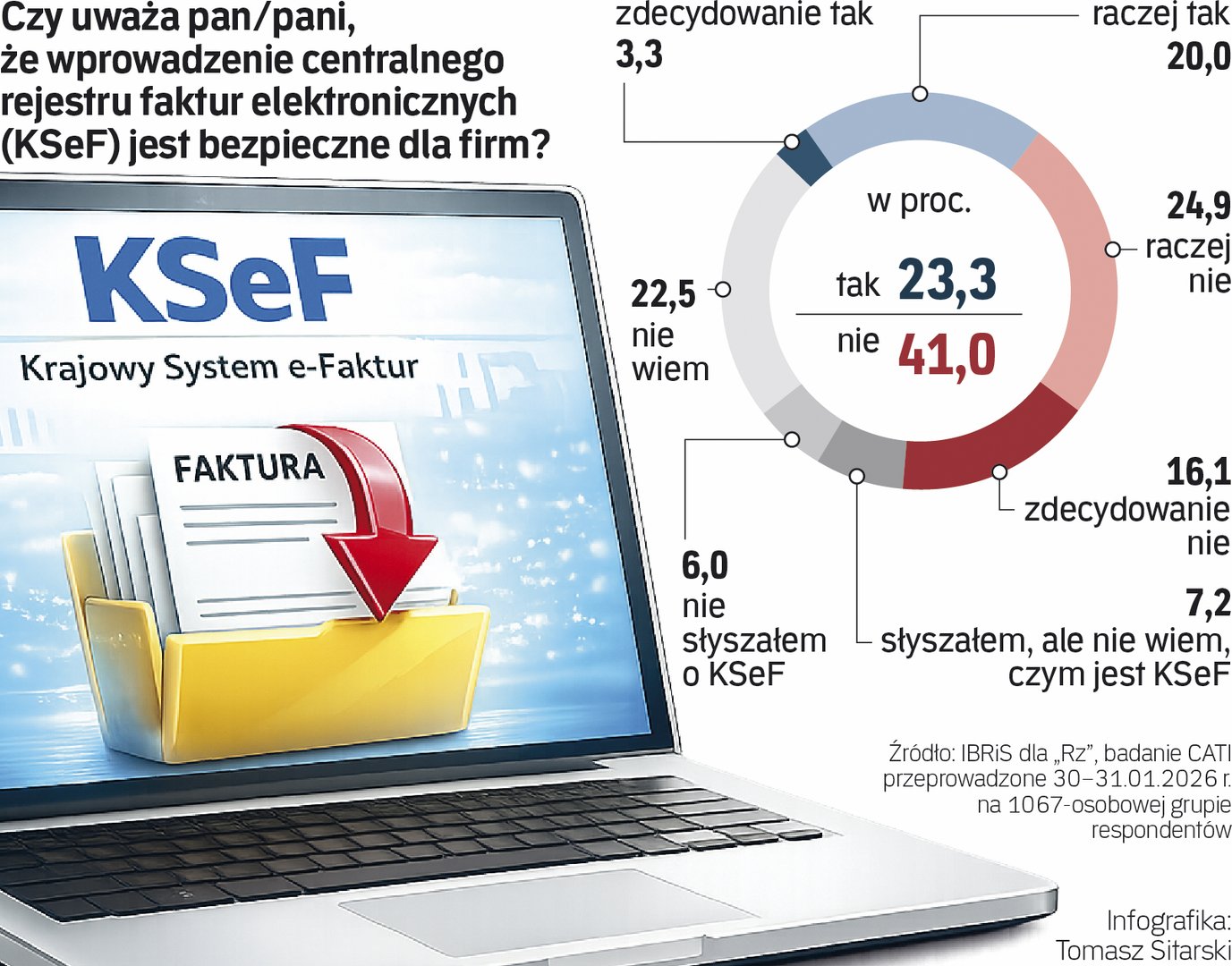 Krajowy System e-Faktur wystartował 1 lutego, rząd zapewnia, że wszystko działa prawidłowo. Ale z sondażu IBRiS przeprowadzonego dla „Rzeczpospolitej” wynika, że tylko 23,3 proc. Polaków uważa, że KSeF jest bezpieczny dla firm. Aż 41 proc. ma odmienne zdanie.