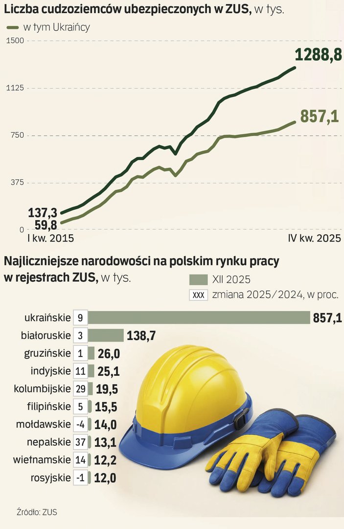 W końcu 2025 r. już prawie 1,29 mln cudzoziemców pracowało legalnie w Polsce. To o 8 proc. (o 96 tys.) więcej niż rok wcześniej – wynika z najnowszych danych ZUS. Pracowników z zagranicy przybyło, choć w tym samym czasie liczba pracujących w sektorze przedsiębiorstw zmalała o 46 tys., przy wzroście bezrobocia z 5,1 do 5,7 proc.