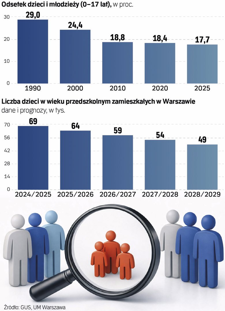 – W oparciu o dane demograficzne przewidujemy, że liczba miejsc w przedszkolach będzie wymagała korekty – mówi „Rz” Wiesław Banaś z poznańskiego magistratu. – Jeżeli niekorzystna tendencja demograficzna się utrzyma, samorząd czekają decyzje o zmianach w sieci placówek oświatowych – wtóruje Włodzimierz Tutaj, rzecznik UM Częstochowy.
