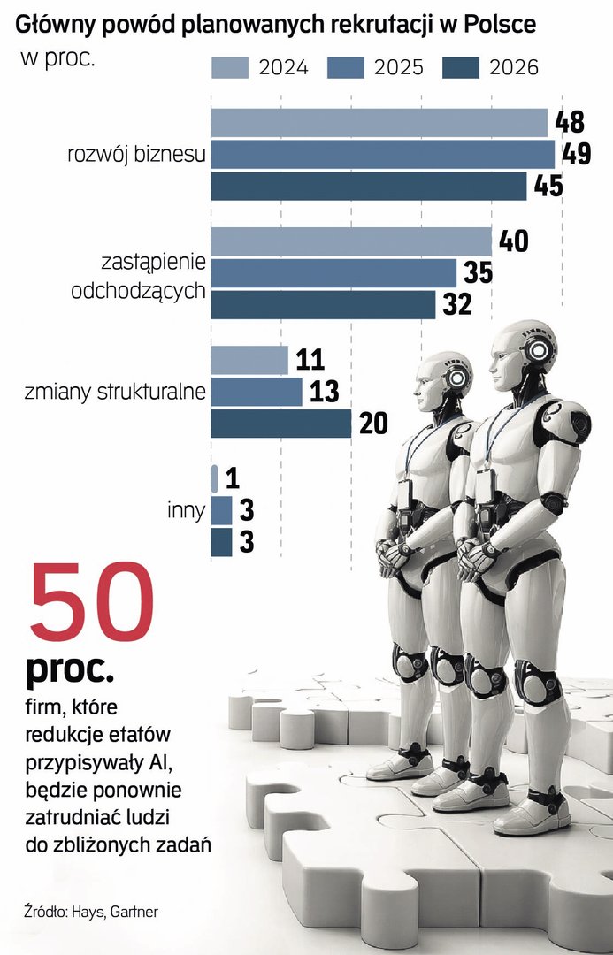 Po fali zachwytu nad sztuczną inteligencją i redukcjach etatów przyszedł czas na niespodziewany zwrot. Do 2027 r. aż 50 proc. firm, które zwolnienia przypisywały wprowadzaniu AI, będzie ponownie zatrudniać ludzi do podobnych zadań – wynika z raportu firmy analitycznej Gartner, który „Rzeczpospolita” opisuje jako pierwsza.