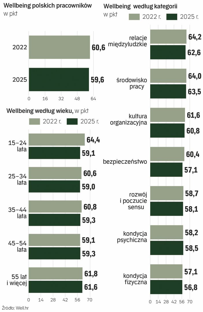 "Rzeczpospolita” jako pierwsza opisuje te wyniki, które pokazują pogorszenie poczucia dobrostanu wśród większości pracujących Polaków. Ogólny wskaźnik wellbeingu spadł na przestrzeni trzech lat do 59,6 pkt., czyli o jeden punkt procentowy w porównaniu z 2022 r. (60,6 pkt.).