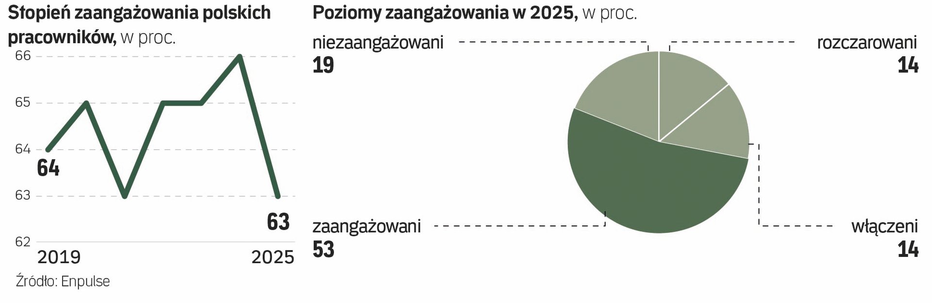 Ogólny poziom zaangażowania pracowników zmalał w ub. r. do 63 proc., o 3 pkt. proc. w porównaniu z 2024 r. Jak zauważa Magdalena Pietkiewicz, która była też inicjatorką badania, ten spadek może wydawać się niewielki, lecz w przypadku wskaźników ogólnych każda różnica procentowa jest istotna. Co więcej, był to pierwszy spadek od 2021 r., gdy nastroje pracowników pogarszała...