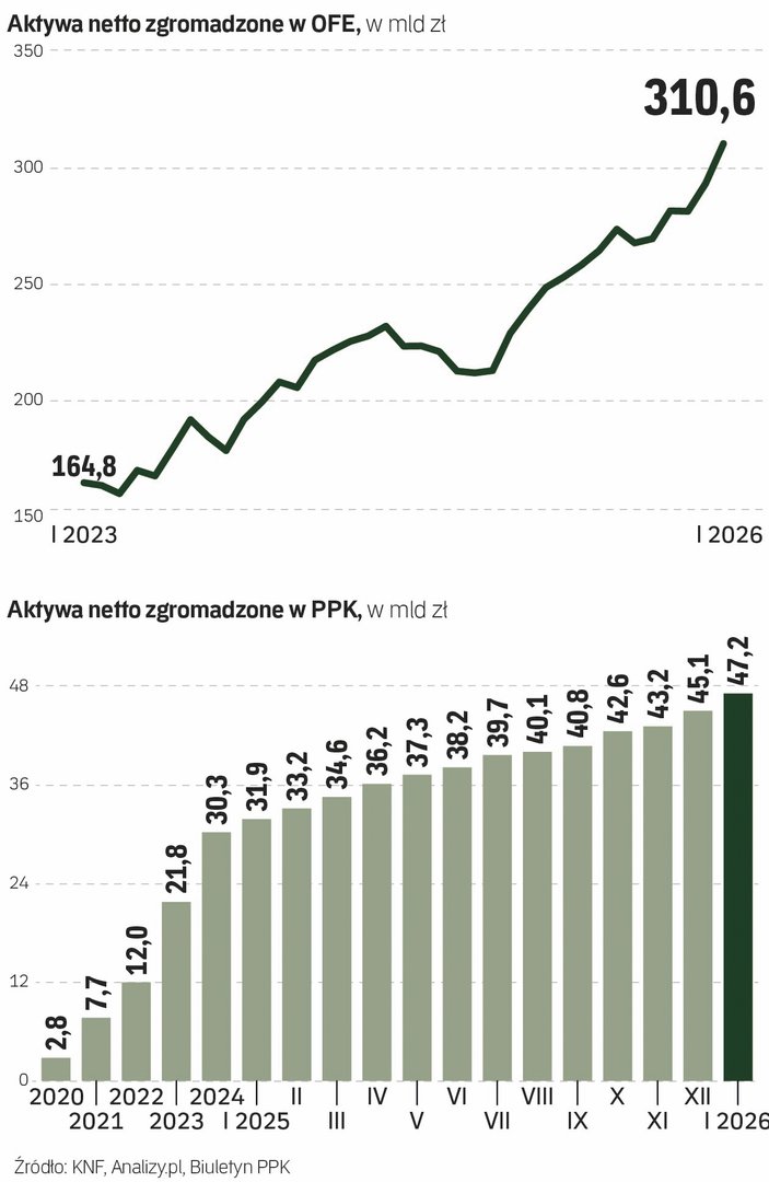 Liczba uczestników Otwartych Funduszy Emerytalnych spadła na początku roku poniżej 14 mln. I dalej będzie spadać, bo młodzi nie palą się do przystępowania do OFE i nie zastępują tych, którzy z tego systemu w sposób naturalny odpływają, przede wszystkim odchodząc na emerytury. Mimo to jednak wartość aktywów zgromadzonych w OFE bije kolejne historyczne rekordy. Na koniec stycznia sięgnęła wedle wyliczeń serwisu Analizy.pl 310,6 mld zł. Oczywiście decydujący wpływ na te wzrosty ma utrzymująca się dobra koniunktura na rynkach finansowych, ale te liczby robią wrażenie.