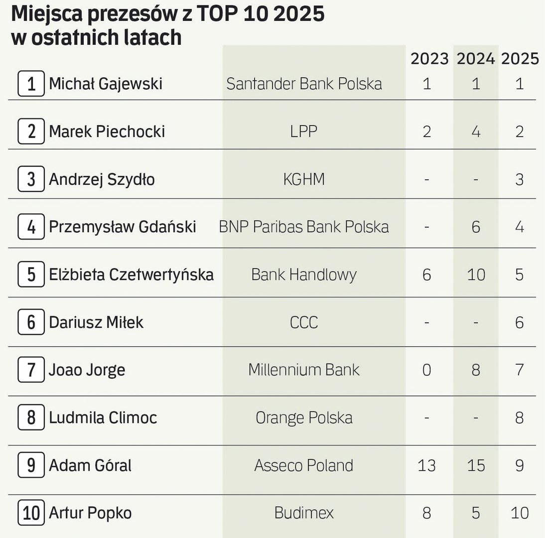 Zestawienie najcenniejszych prezesów jest opracowywane na podstawie: kapitalizacji firmy, zmiany ceny akcji, wyniku EBITDA i oceny kompetencji menedżerskich. Pierwsza trójka rankingu „Wyceny prezesów #TOP30 polskiej giełdy” za 2025 r. jest warta łącznie niemal 4,4 mld zł, czyli prawie o jedną trzecią mniej niż przed rokiem, co wynika m.in. z dużych zmian w czołówce. Pozycję lidera utrzymał wyceniany obecnie na prawie 2,25 mld zł Michał Gajewski, ale – w ramach zaplanowanych sukcesji – ze swoich stanowisk odeszli w ub. roku dwaj menedżerowie wyceniani łącznie na 3,8 mld zł: zdobywca drugiego miejsca, Brunon Bartkiewicz, wieloletni prezes ING Banku Śląskiego i zajmujący trzecią pozycję Roy Perticucci, który przeszedł ze stanowiska prezesa...