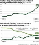 Jednocześnie szybko rośnie udział papierów skarbowych w bilansach banków. Według szacunków ZBP obecnie stanowią one już ok. 20 proc. aktywów sektora (nie licząc obligacji gwarantowanych przez SP), podczas gdy rok wcześniej było to wyraźnie poniżej 20 proc., a w latach 2016–2019 średnio 15–17 proc. I właśnie coraz większy udział rządowego długu zaczyna niepokoić regulatorów rynku.