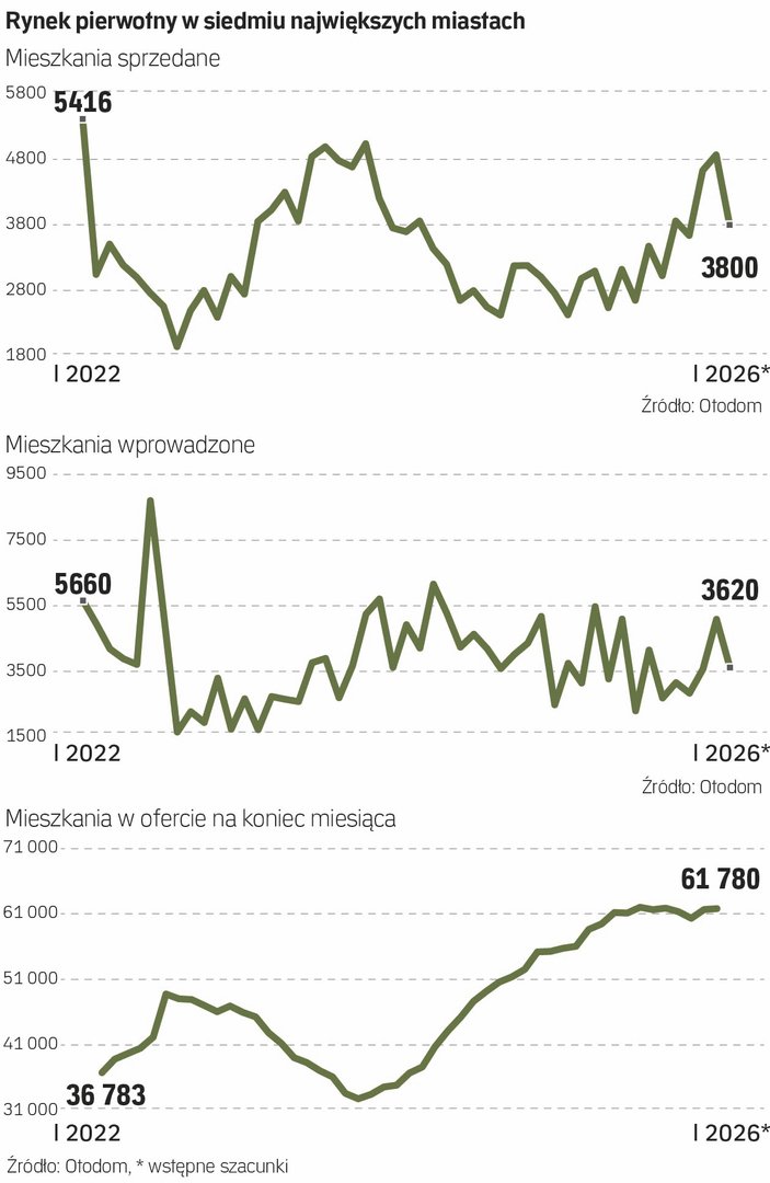 Początek bieżącego roku przyniósł jednak mieszane uczucia, bo według wstępnych szacunków Otodomu deweloperzy w siedmiu największych miastach znaleźli nabywców na około 3,8 tys. mieszkań, czyli znacznie mniej niż w napędzanych akcjami marketingowymi listopadzie i grudniu. Wstępnie szacowana sprzedaż sięgała wtedy odpowiednio ponad 5 tys. i prawie 5,2 tys., a po korektach – wyniki ostateczne są mniejsze od wstępnych – odpowiednio 4,6 tys. i 4,9 tys. Ostateczne wyniki za styczeń poznamy na początku marca.