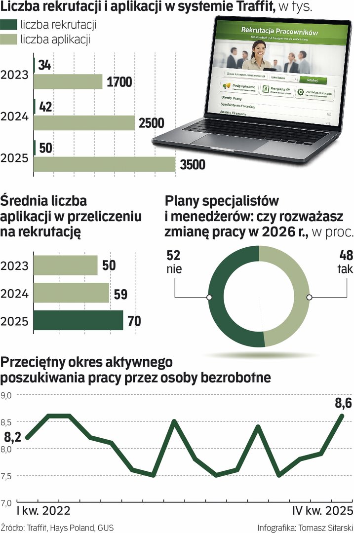 Średnia liczba zgłoszeń w przeliczeniu na rekrutacje wzrosła w ubiegłym roku do 70, czyli była prawie o jedną piątą większa niż rok wcześniej – wynika z udostępnionych „Rzeczpospolitej” danych systemu rekrutacyjnego Traffit. Jego dane obejmują tylko część rynku, ale zwiększony napływ aplikacji (CV) nadsyłanych w odpowiedzi na oferty pracy widać również w statystykach portali rekrutacyjnych. W tym rynkowego lidera, serwisu Pracuj.pl; przy lekkim spadku liczby ofert pracy (do 763 tys.) użytkownicy serwisu nadsyłali średnio 4 mln CV miesięcznie.