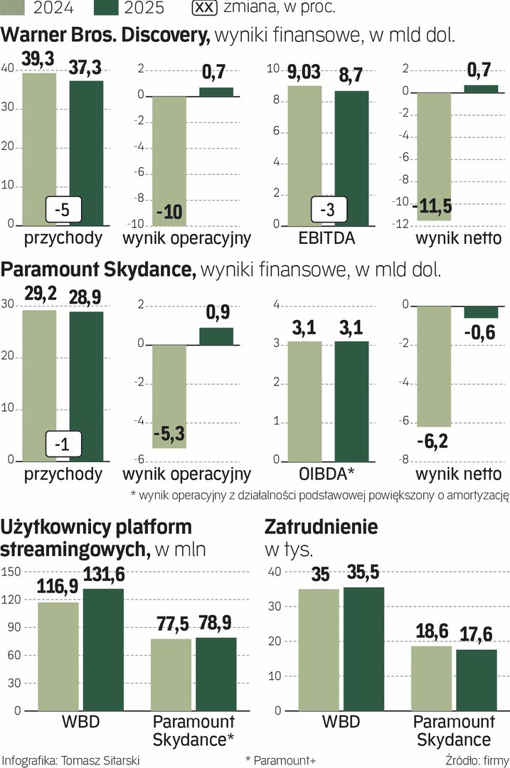 Zgodnie z ogłoszoną z piątku na sobotę umową, Paramount Skydance kontrolowany od sierpnia ub.r. przez rodzinę Ellisonów, za akcję WBD zapłaci 31 dol., co daje kwotę około 77 mld dol. za wszystkie walory. A ponieważ musi wziąć na siebie też kredyty, w sumie musi zgromadzić 110 mld dol., co wywinduje wskaźnik zadłużenia Paramountu do 4,3. Cena wygląda na wysoką: stanowi ponad 12-krotność ubiegłorocznego zysku EBITDA WBD. Jednak Paramount...