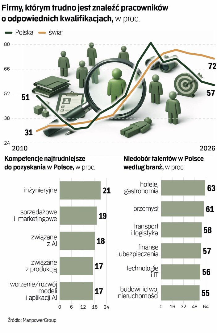 Hotelarstwo, gastronomia i turystyka oraz produkcja przemysłowa – to trzy sektory, w których przedsiębiorcy najczęściej narzekają na niedobór talentów, czyli pracowników z potrzebnymi firmom kompetencjami. Odsetek takich wskazań przekracza tam 60 proc., a w informacji i komunikacji sięga 67 proc. – wynika z tegorocznej edycji raportu z badania „Niedobór Talentów” agencji zatrudnienia ManpowerGroup, które objęło łącznie 39 tys. przedsiębiorstw z 41 państw, w tym z Polski.