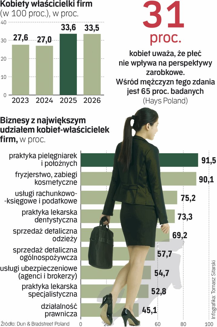 Jednak zarówno wśród prezesów firm, jak też wśród ponad 2,5 mln stuprocentowych właścicieli biznesów, udział kobiet jest obecnie nieco mniejszy niż rok wcześniej. Co prawda nie jest to duża zmiana – odsetek pań, które są wyłącznymi właścicielkami biznesów zmalał do niespełna 33,5 proc. z ponad 33,6 proc. przed rokiem. Nadal jest to jednak bardzo liczna grupa, sięgająca 845,6 tys. Sporo jest też pań na czele zarządów.