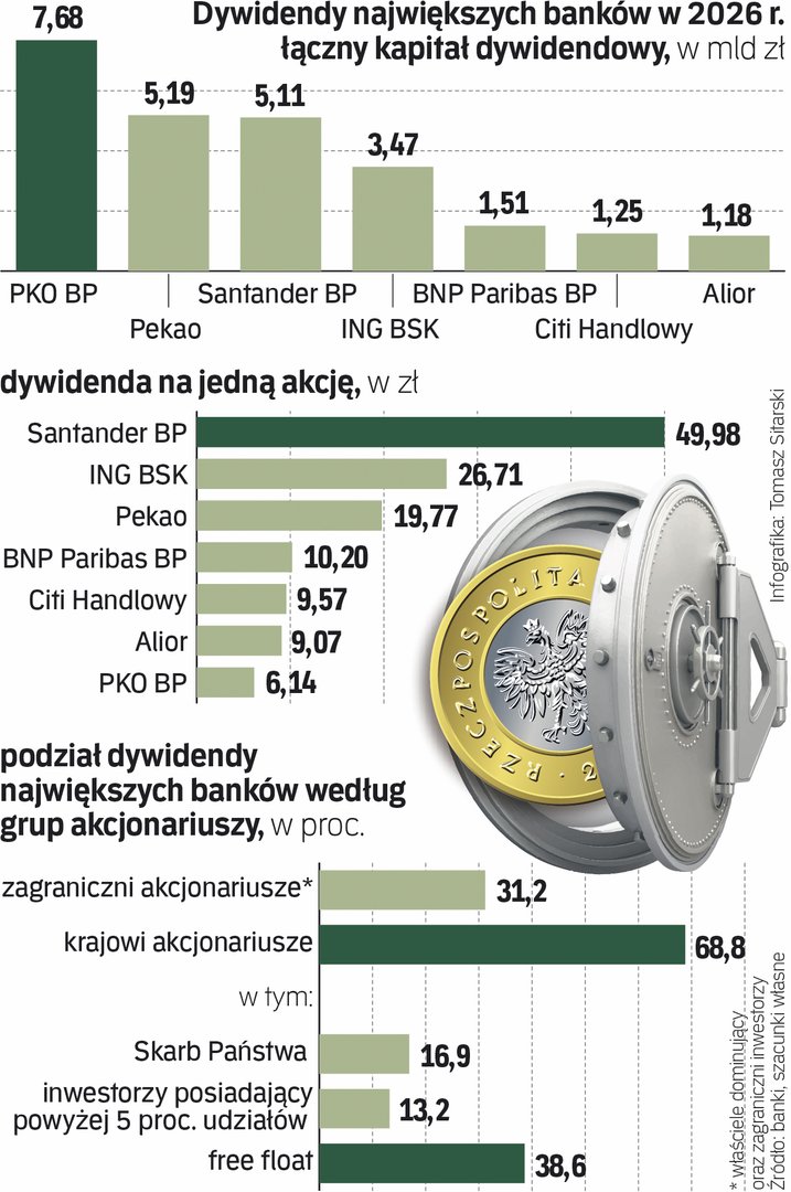 Najwięcej trafi do akcjonariuszy największych banków, przy czym zdecydowanym liderem pod względem łącznej wartości wypłaty pozostaje nr 1 rynku PKO BP. Według prognoz analityków spółka może przeznaczyć na dywidendę aż 7,68 mld zł, czyli 75 proc. swojego zarobku za 2025 r.