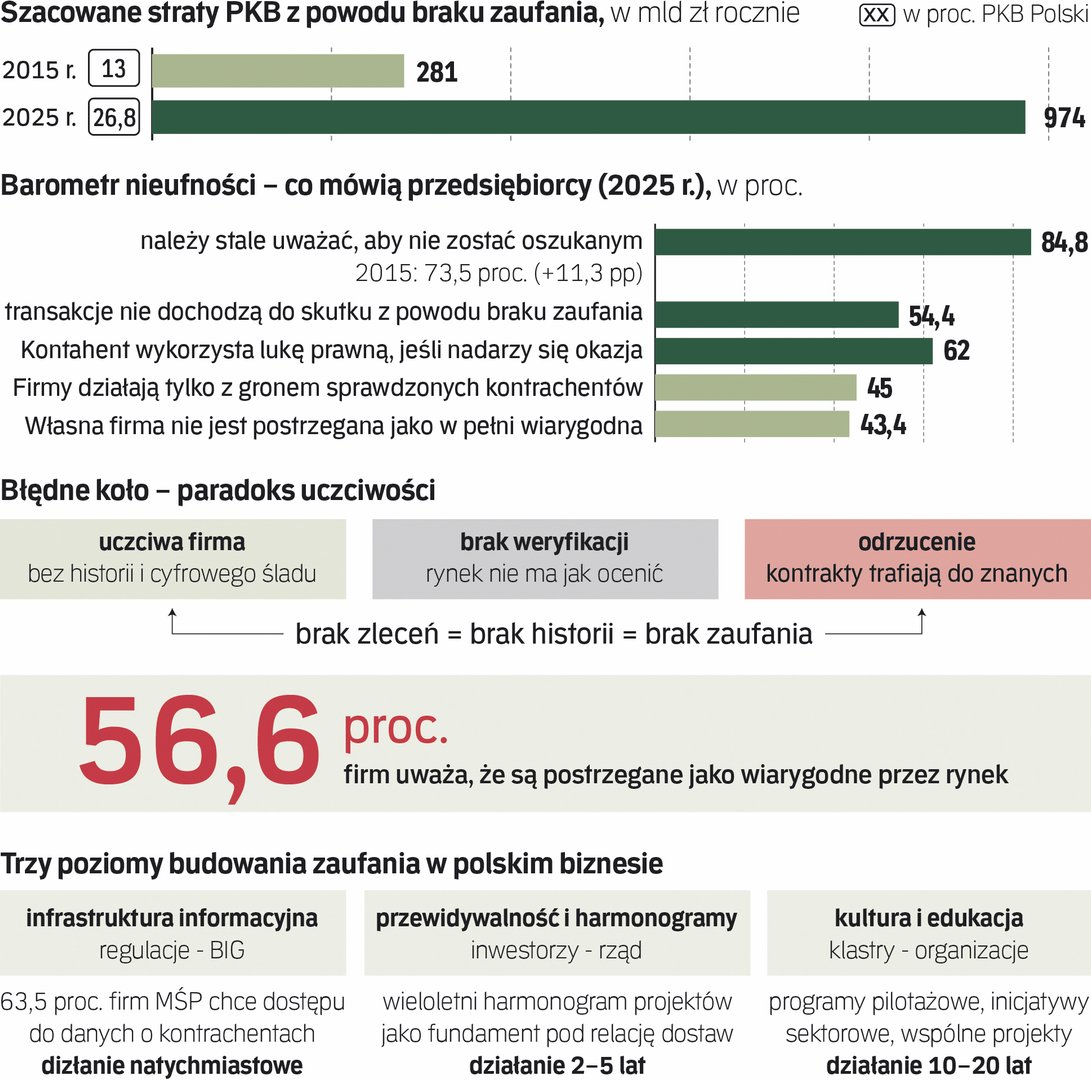 Raport „Kapitał społeczny i zaufanie w polskim biznesie 2025”, opracowany przez Uniwersytet Ekonomiczny w Poznaniu na zlecenie Krajowego Rejestru Długów Biura Informacji Gospodarczej, szacuje straty wynikające z deficytu zaufania w polskim biznesie na 974 miliardy złotych rocznie – czyli 26,8 proc. PKB. To koszt transakcji, których nie zawarto – nie dlatego, że były nieopłacalne, lecz dlatego, że po drugiej stronie stała nieznana firma, a zaufania – lub narzędzi do jego weryfikacji – brakowało.