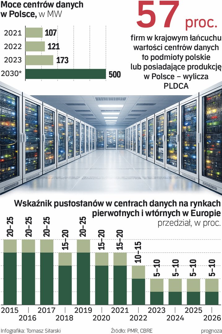 Polski rynek centrów danych przekroczył pułap 200 MW mocy, w ciągu trzech lat rosnąc o 100 proc. Jak wynika z analiz Polish Data Center Association (PLDCA), nasz kraj odpowiada już za przeszło jedną trzecią mocy takich instalacji w regionie. Eksperci prognozują, iż do 2030 r. łączna moc tego typu obiektów nad Wisłą sięgnie 500 MW. Ale to kropla w morzu potrzeb. Boom na takie inwestycje ruszył, napędzany przez technologie chmurowe i AI. Hamuje go walka o prąd. A w tle toczy się rozgrywka o suwerenność technologiczną.
