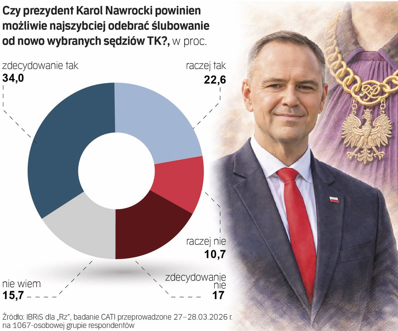 Prawie 57 proc. badanych w sondażu IBRiS dla „Rzeczpospolitej” uważa, że Karol Nawrocki powinien jak najszybciej odebrać ślubowanie od nowo wybranych sędziów Trybunału Konstytucyjnego. Przeciwnego zdania jest ok. 28 proc. respondentów, a ponad 15 proc. nie ma zdania.