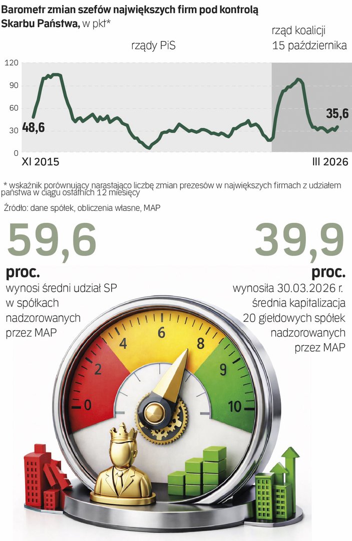 Początek 2026 r. nie był okresem spokoju w zarządach największych spółek z bezpośrednim lub pośrednim udziałem Skarbu Państwa. Nasz Barometr Prezesów, który narastająco mierzy zmiany dokonane w ostatnich 12 miesiącach na czele kluczowych firm pozostających pod kontrolą państwa, wzrósł w marcu do 35,6 pkt, czyli do najwyższego poziomu od wiosny 2025 r.