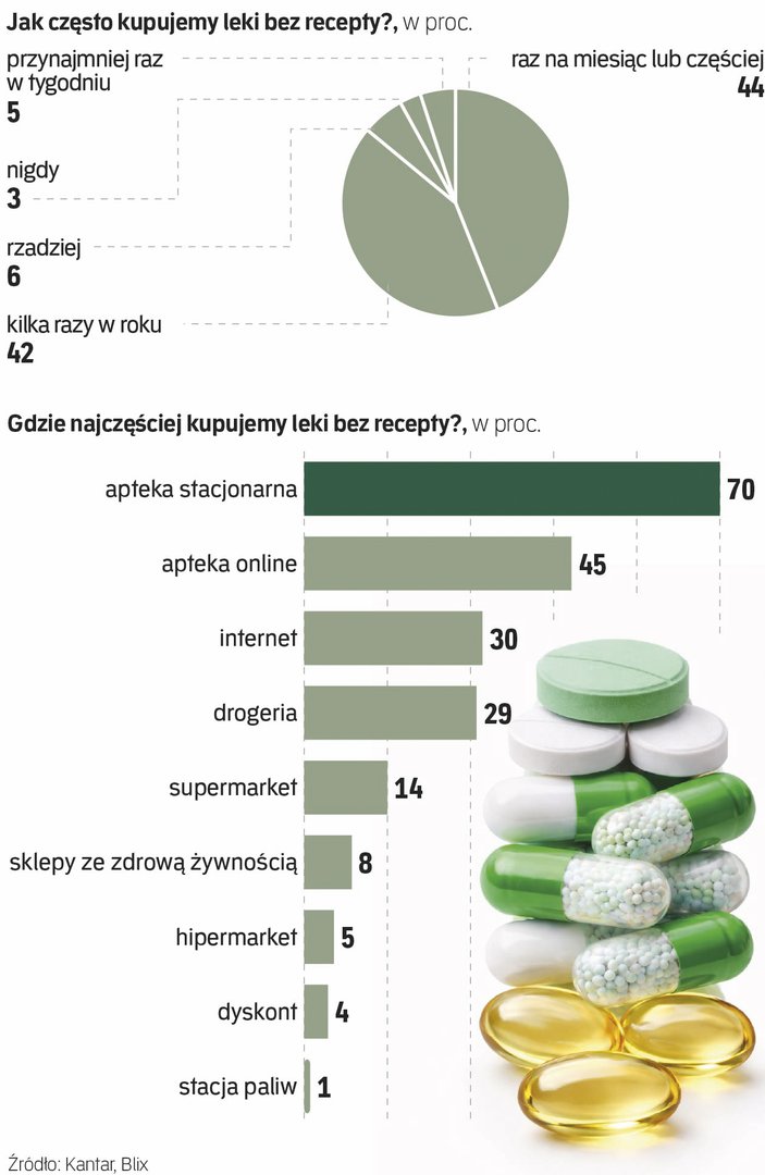 18 proc. konsumentów wydaje na tego rodzaju produkty do 500 zł w ciągu trzech miesięcy, a 18 proc. nawet więcej. I to najczęściej wskazywane odpowiedzi na pytanie o wydatki na ten cel – wynika z badania Kantar i Grupy Blix, którego wyniki „Rzeczpospolita” poznała jako pierwsza. Choć 70 proc. konsumentów nadal najczęściej kupuje leki bez recepty w aptekach, to już 45 proc. wskazuje na apteki online, a 30 proc. ogólnie na internet i platformy zakupowe jak np. Allegro.