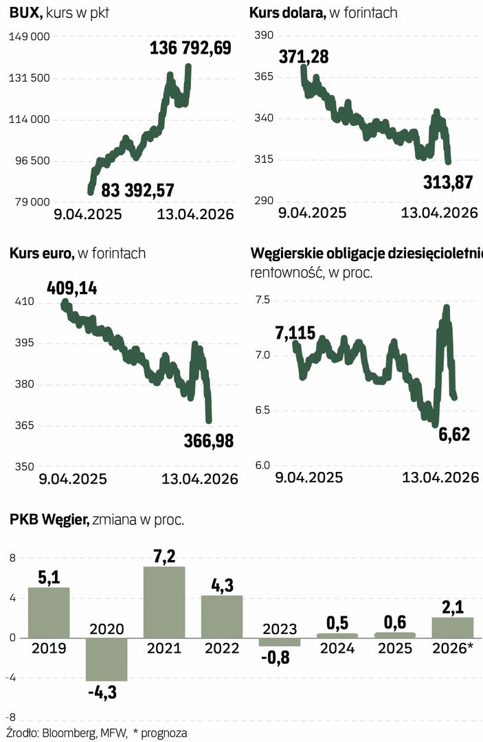 BUX, główny indeks giełdy węgierskiej, zyskiwał w poniedziałek ponad 3 proc. i był najmocniej rosnącym indeksem giełdowym w Europie. Znaczna większość indeksów ze Starego Kontynentu wówczas lekko spadała, ze względu na fiasko amerykańsko-irańskich negocjacji pokojowych. Natomiast BUX po raz pierwszy w historii przebił poziom 137 tys. pkt i ustanowił rekord. Impulsem dla tej zwyżki był wynik niedzielnych wyborów parlamentarnych na Węgrzech, w wyniku których premier Viktor Orbán i jego partia Fidesz stracili władzę po 16 latach rządów, a prounijna partia Tisza zdobyła większość konstytucyjną.