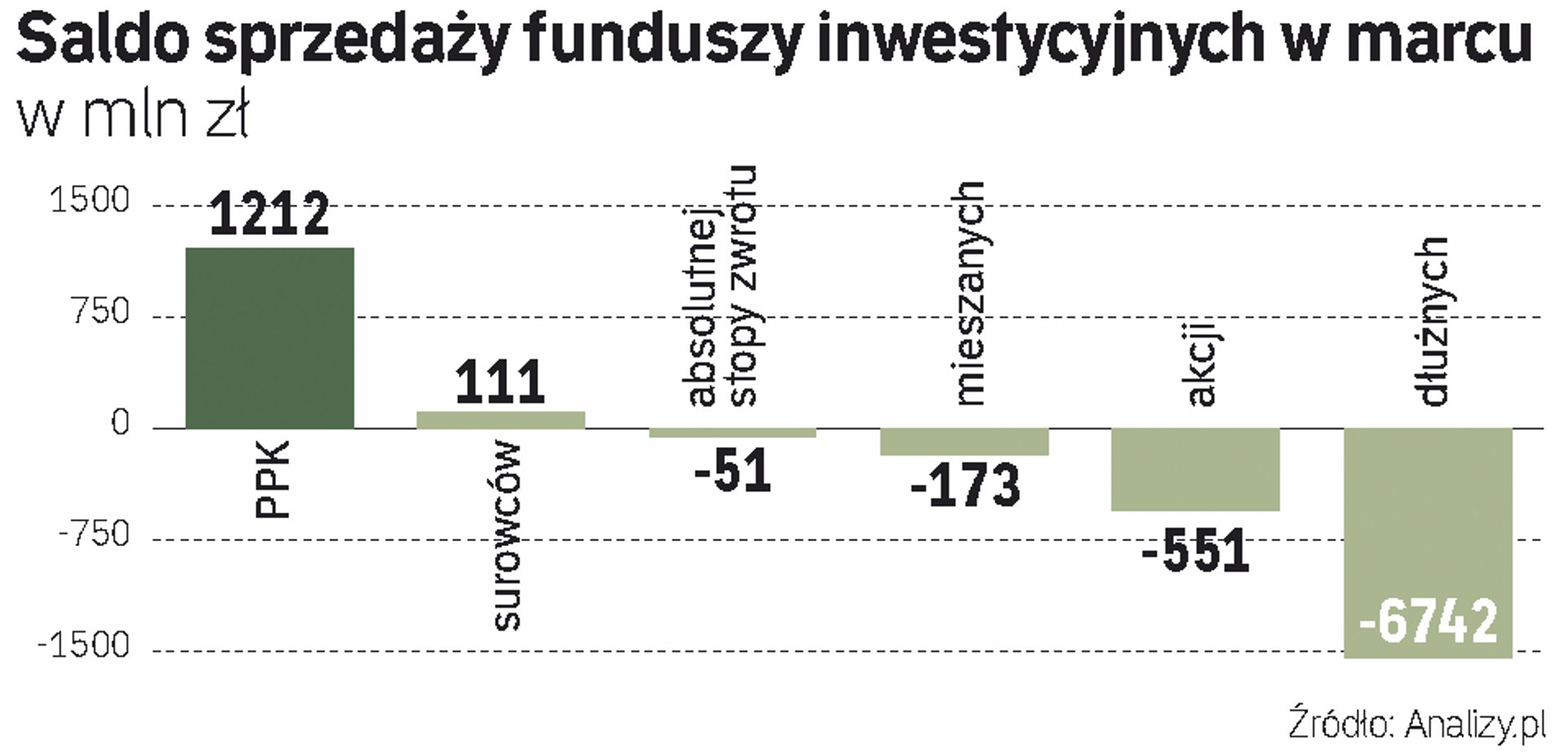 Marzec brutalnie przerwał sielankę na krajowym rynku funduszy, na którym od ponad trzech lat nieprzerwanie miesiąc w miesiąc dopływały oszczędności klientów. Jak wynika z danych serwisu Analizy.pl, łączna przewaga umorzeń w funduszach detalicznych sięgnęła aż 7,3 mld zł wobec 8,5 mld zł wpłat netto w lutym. Sytuację ratowały pracownicze plany kapitałowe, do których w marcu powędrowała rekordowa suma 1,2 mld zł. Ostatecznie zatem saldo sprzedaży funduszy sięgnęło w marcu minus 6,2 mld zł i był to pierwszy raz od 38 miesięcy z przewagą wypłat nad wpłatami.