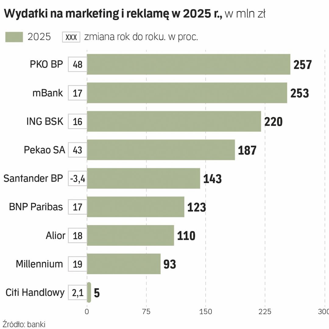 Największym reklamodawcą wśród banków został w 2025 r. PKO BP, który zwiększył wydatki marketingowe aż o 48 proc., do 257 mln zł. Tak potężny budżet pozwolił największemu polskiemu bankowi na zdominowanie przestrzeni medialnej, z konsekwentnie realizowanym od dwóch lat przekazem odświeżenia swojego wizerunku. To kampanie skierowane zarówno do małych i dużych przedsiębiorstw, jak i do klientów detalicznych – ostatnim przykładem może być kampania poświęcona nowej usłudze KLIK,...