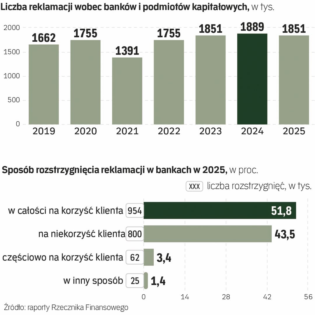 Z najnowszych danych Rzecznika Finansowego wynika, że w 2025 r. Polacy wnieśli ok. 1,85 mln reklamacji bezpośrednio do banków i innych podmiotów rynku kapitałowego. W porównaniu z 2024 r. oznacza to delikatny spadek, ale w relacji np. do pandemicznego 2021 r., gdy liczba skarg wynosiła 1,39 mln, mowa raczej o utrzymywaniu się problemu na rekordowo wysokim poziomie.