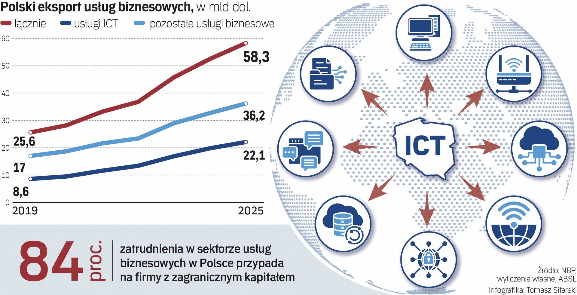 Wpływy z eksportu polskiego sektora usług dla biznesu w ubiegłym roku przekroczyły 58,3 mld dol., rosnąc aż o 11 proc. rok do roku – wynika z wyliczeń „Rzeczpospolitej” na podstawie najnowszych danych Bilansu Płatniczego NBP.
