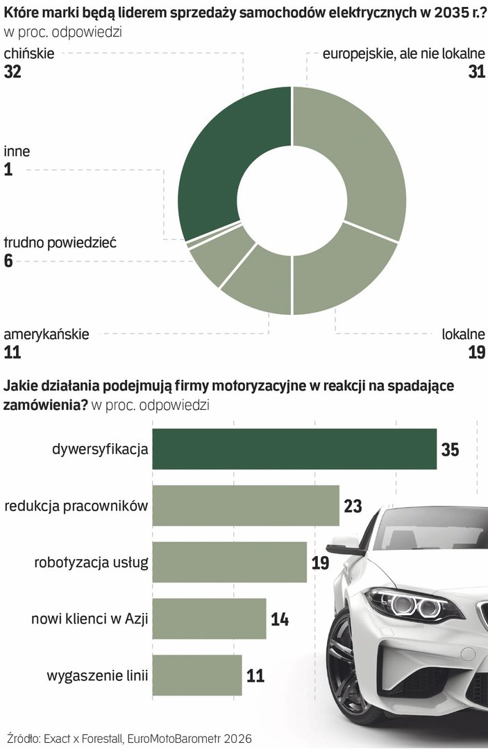 Polska branża motoryzacyjna jest rozdarta między Europą a Chinami. Niepublikowany jeszcze raport „EuroMotoBarometr 2026. Nastroje Automotive w Europie” firmy Exact x Forrestal, do którego dotarła „Rzeczpospolita”, pokazuje, że przedsiębiorcy w Polsce boją się chińskiej konkurencji, ale we współpracy z nią upatrują szanse na rynkowy sukces. Chcieliby hamować jej ekspansję, ale też robić z Chinami biznes. Z badania menedżerów sektora wynika, że 56 proc. firm działających w przemyśle motoryzacyjnym w Polsce współpracuje z chińskimi producentami. Paradoksalnie niewiele mniej – 54 proc. popiera nałożone na samochody z Chin cła.