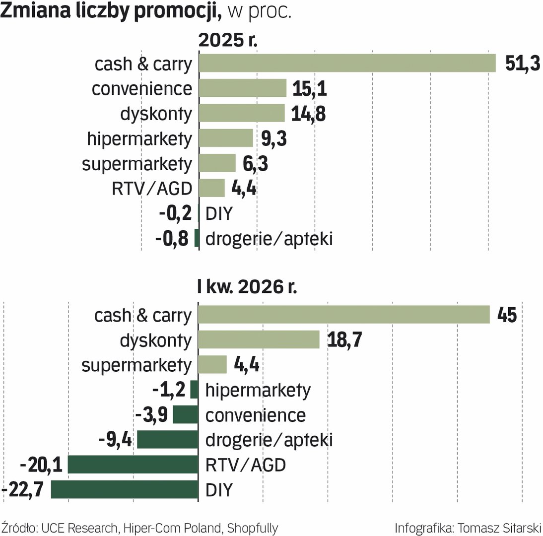 W sklepach typu cash&carry w I kwartale liczba promocji w ujęciu rocznym wzrosła o 45 proc., w dyskontach – o 18,7 proc. Największe spadki odnotowały markety budowlane, gdzie było 22,7 proc. promocji mniej, i sklepy RTV-AGD (-20,1 proc.) – wynika z analizy Shopfully Poland, UCE Research oraz Hiper-Com Poland, której wyniki „Rzeczpospolita” poznała jako pierwsza.