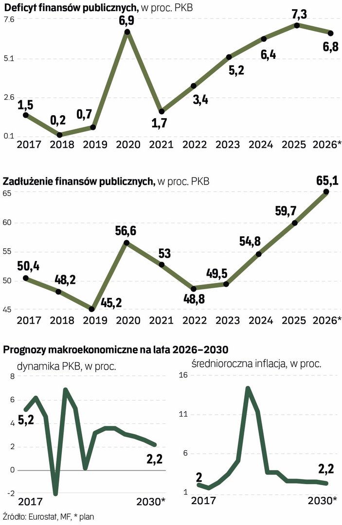 Rząd zakłada stopniowe ograniczanie deficytu, jednak skala planowanych działań oraz rosnący dług publiczny budzą wątpliwości ekonomistów co do tempa i trwałości poprawy finansów państwa.